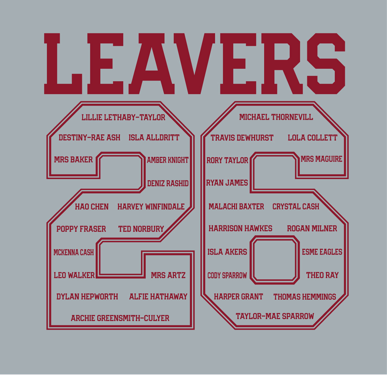• Redbrook Hayes Logo left chest with LEAVERS 2026 underneath.