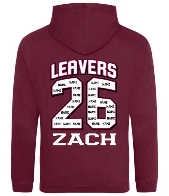 St Stephens Leavers 26 Hoodie complete with embroidered School Logo, Leavers 26 print on the back with your childs name inside and your choice of name / nickname underneath.